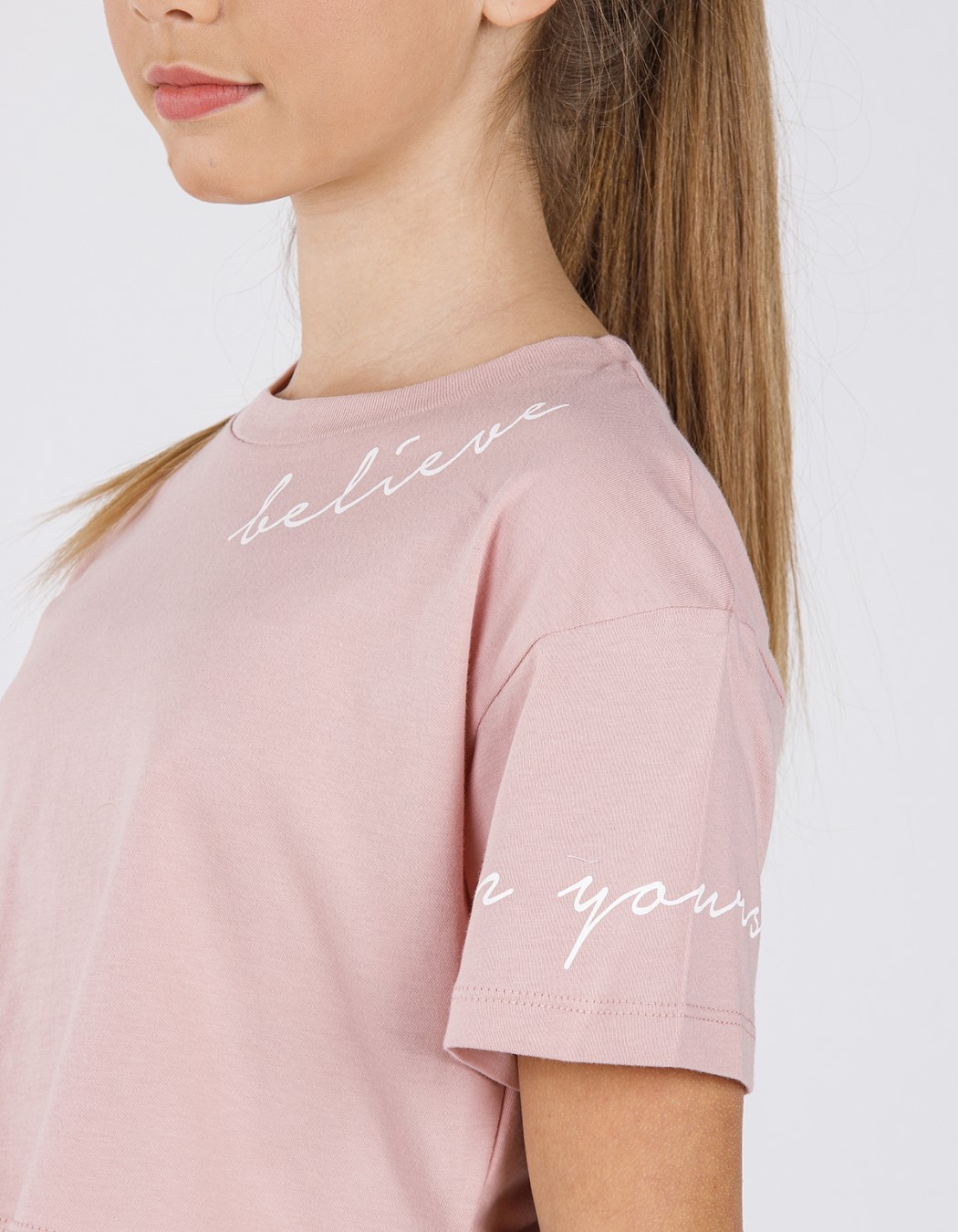 Укороченная футболка DMB для девочки оптом. Модель свободного кроя с лаконичным принтом.