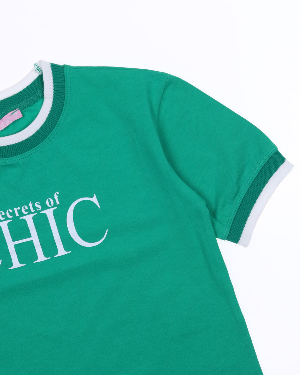 Футболка для девочки укороченная  оптом выполнена из плотного, мягкого трикотажа и украшена графичным принтом. Горловина круглой формы,  низ рукавов обработан трикотажными манжетами.
