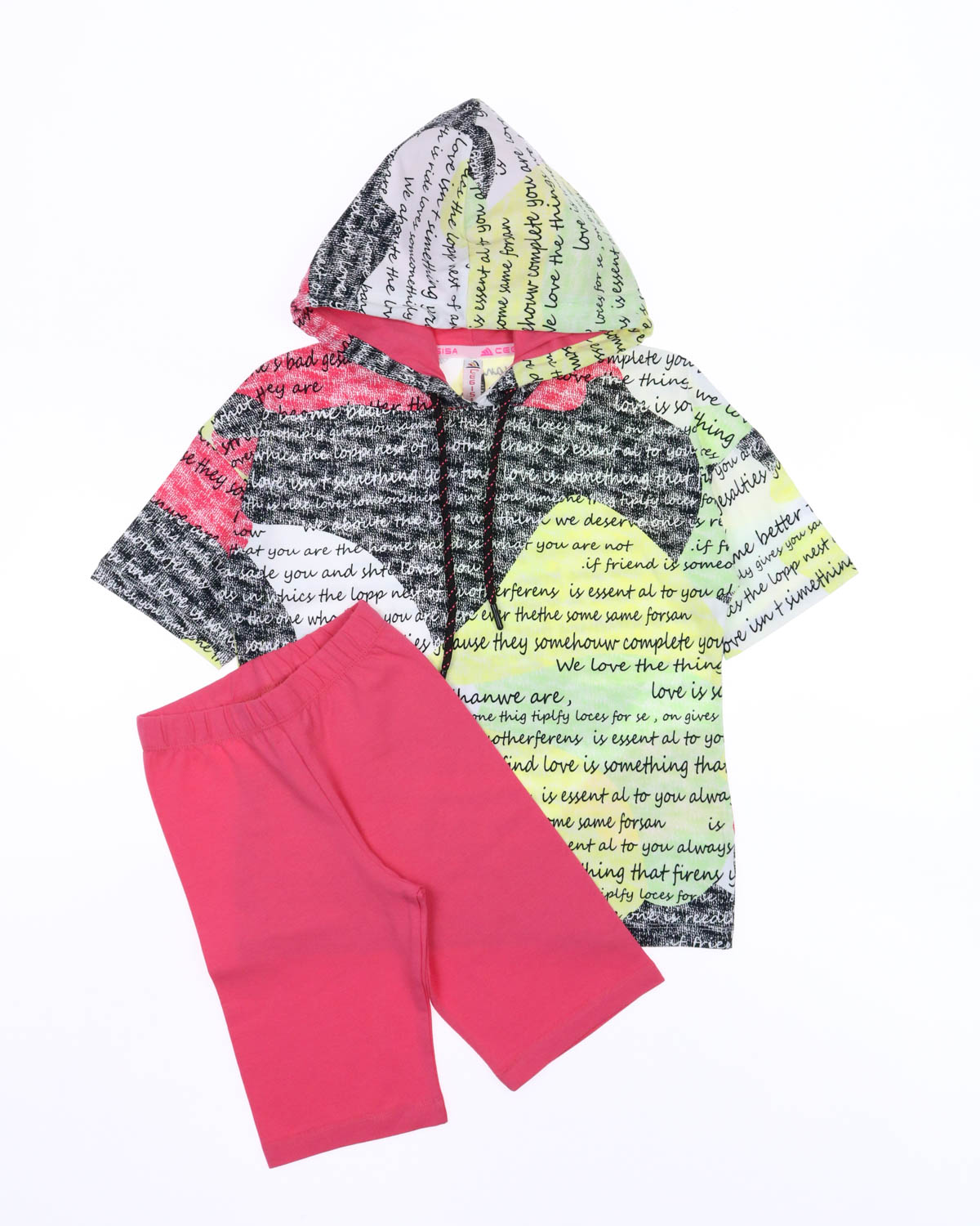 Летний костюм Cegisa для девочки оптом. Футболка с короткими рукавами, украшеная принтом и дополнена капюшоном со шнурком. Однотонные велосипедки облегающего кроя с поясом на резинке. Костюм изготовлен из хлопка с добавлением лайкры.