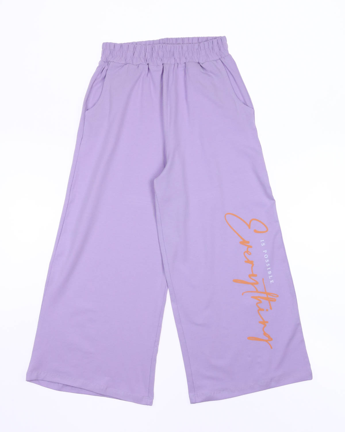 Стильный костюм Smile для девочки оптом. Укороченная футболка свободного кроя оформлена принтом. Рукава присборены резинкой. Широкие брюки с боковыми карманами и защипами на поясе создают модный образ. Костюм Smile для девочки оптом, выполнен из трикотажа кулирка.