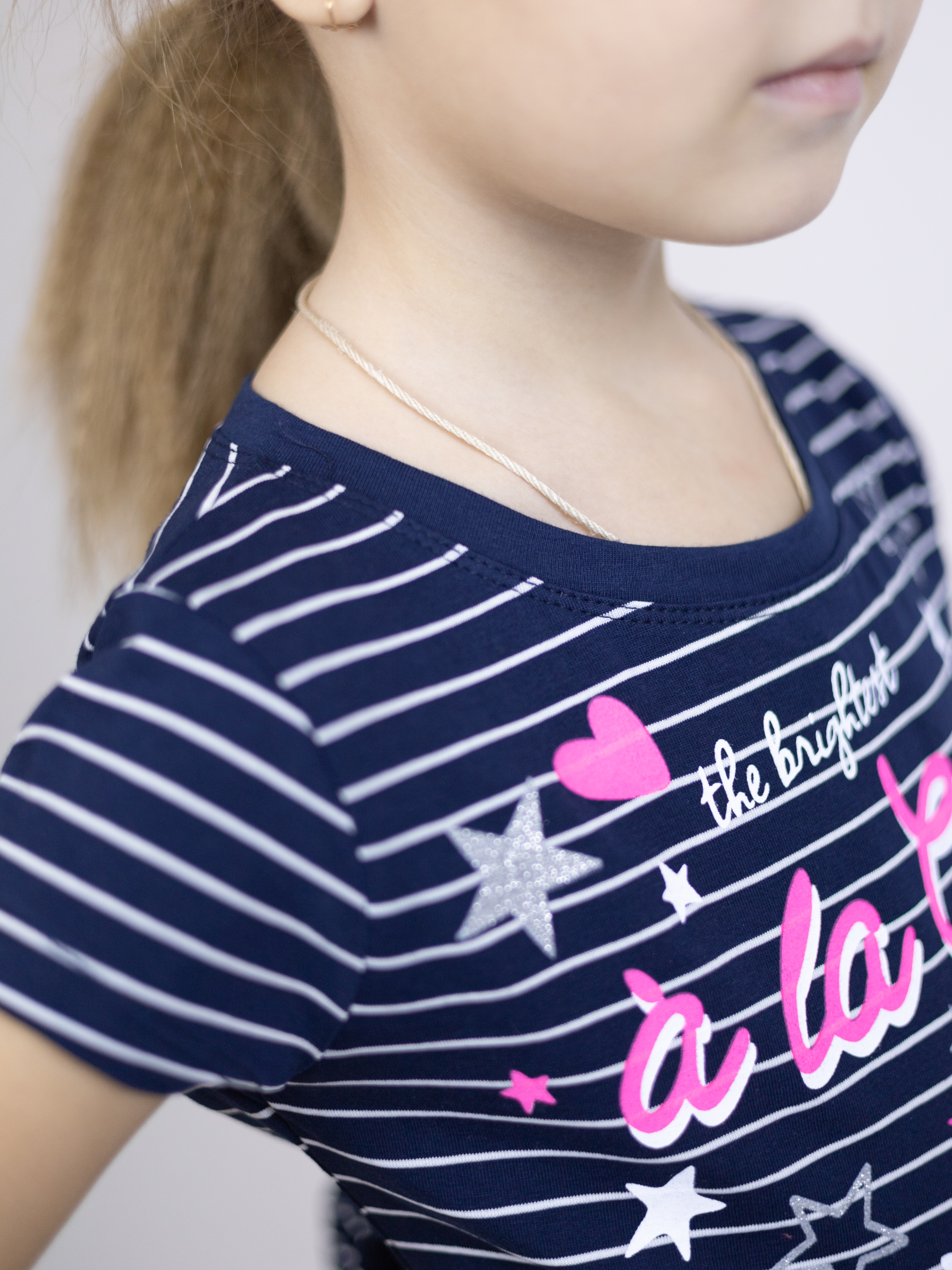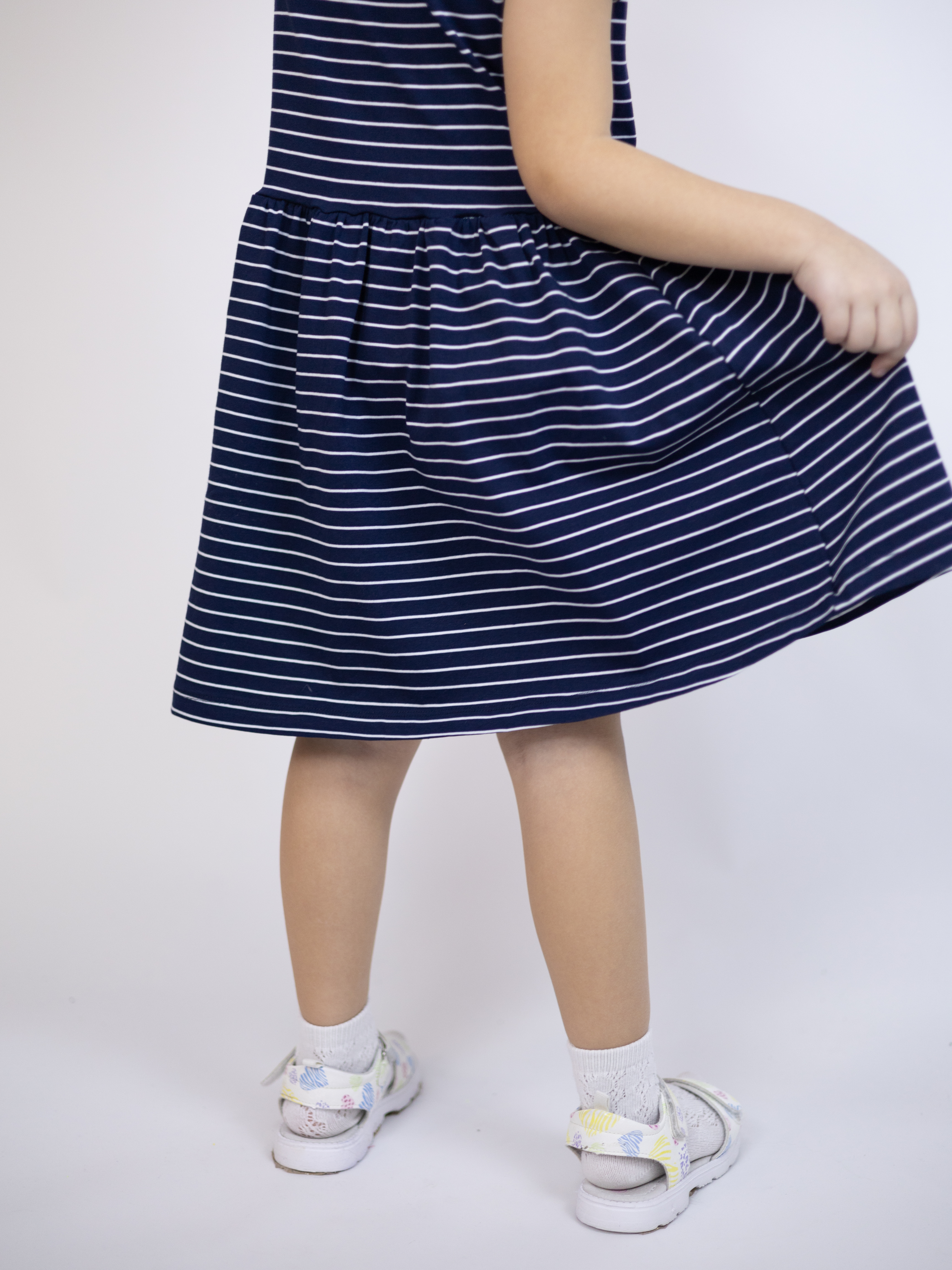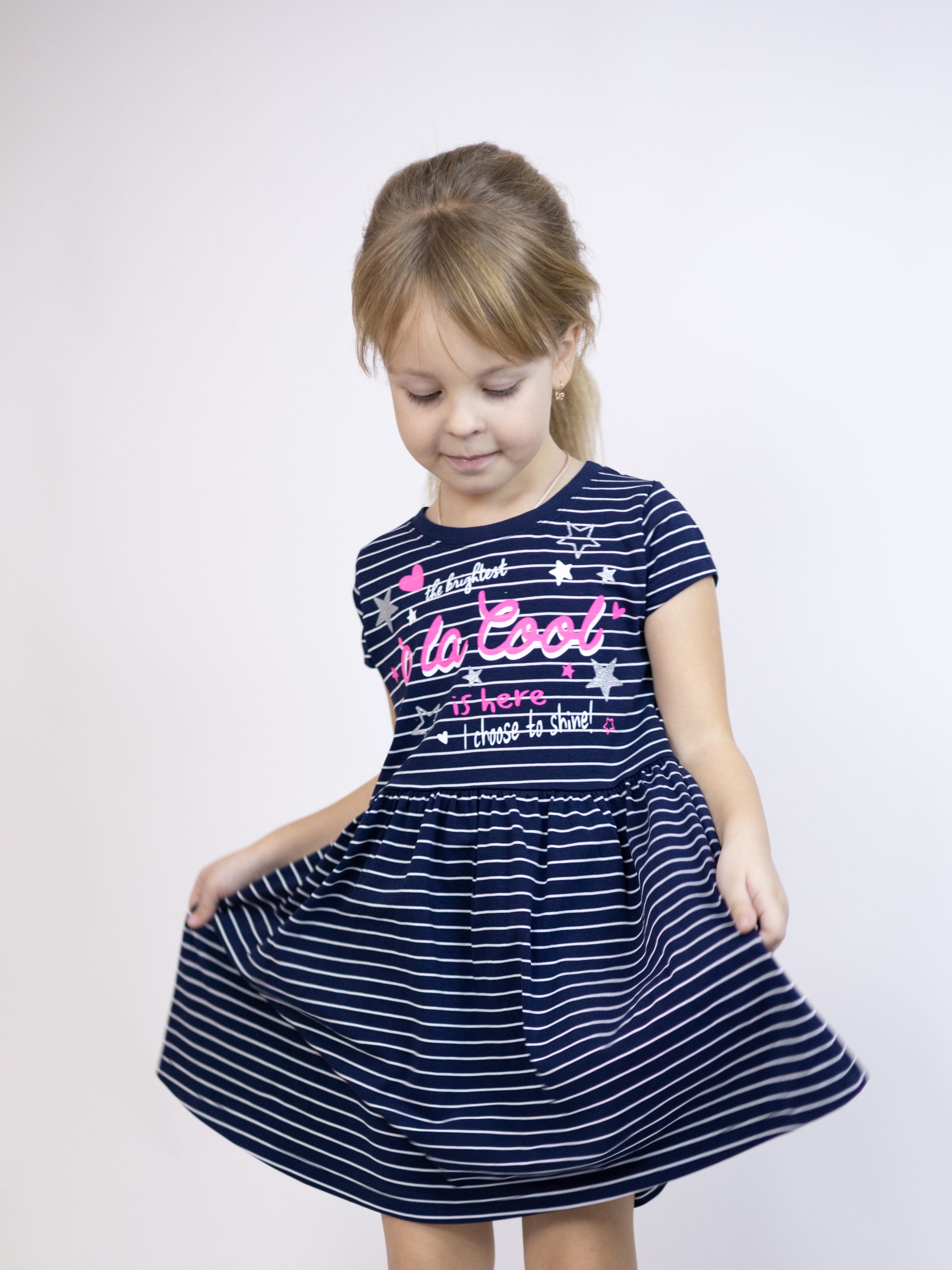 Милое повседневное трикотажное платье FIRST для принцессы! Легкая трикотажная ткань, летящая юбочка со сборкой на талии - девочкам очень нравится такой крой. Для детского сада, дома, на прогулки!