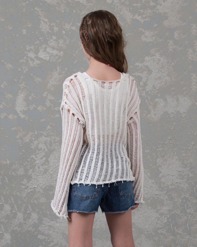 Джемпер DMB для девочек ажурной вязки оптом, выполнен из хлопка. Свободный крой, круглый вырез горловины. Модель отлично сочетается с любой одеждой. Под низ можно надеть удлиненный или короткий топ в тон джемперу.