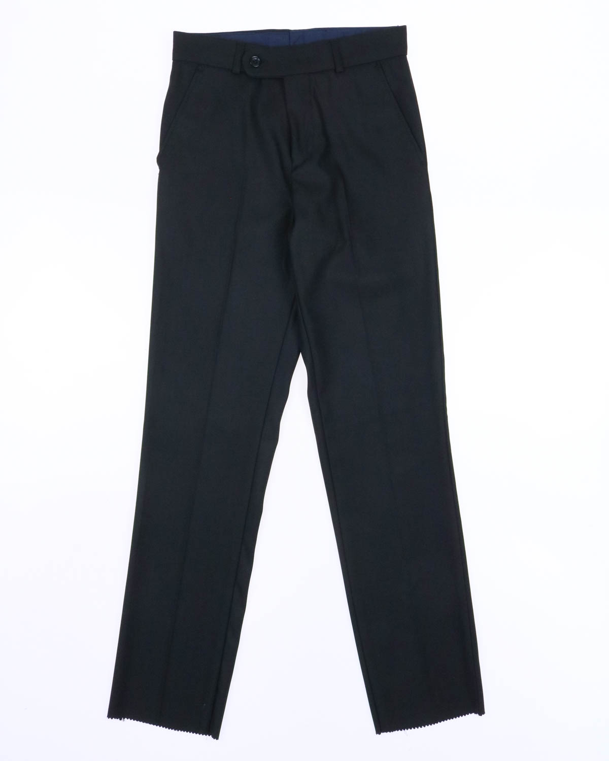 Классические брюки для мальчика выполнены из хлопкового полотна с лайкрой. Нижний срез брюк обработан, но не подшит, что позволяет родителям подобрать длину брюк индивидуально. Так же изделие дополняют два боковых кармана и один сзади на пуговице. Отличный вариант для школы!