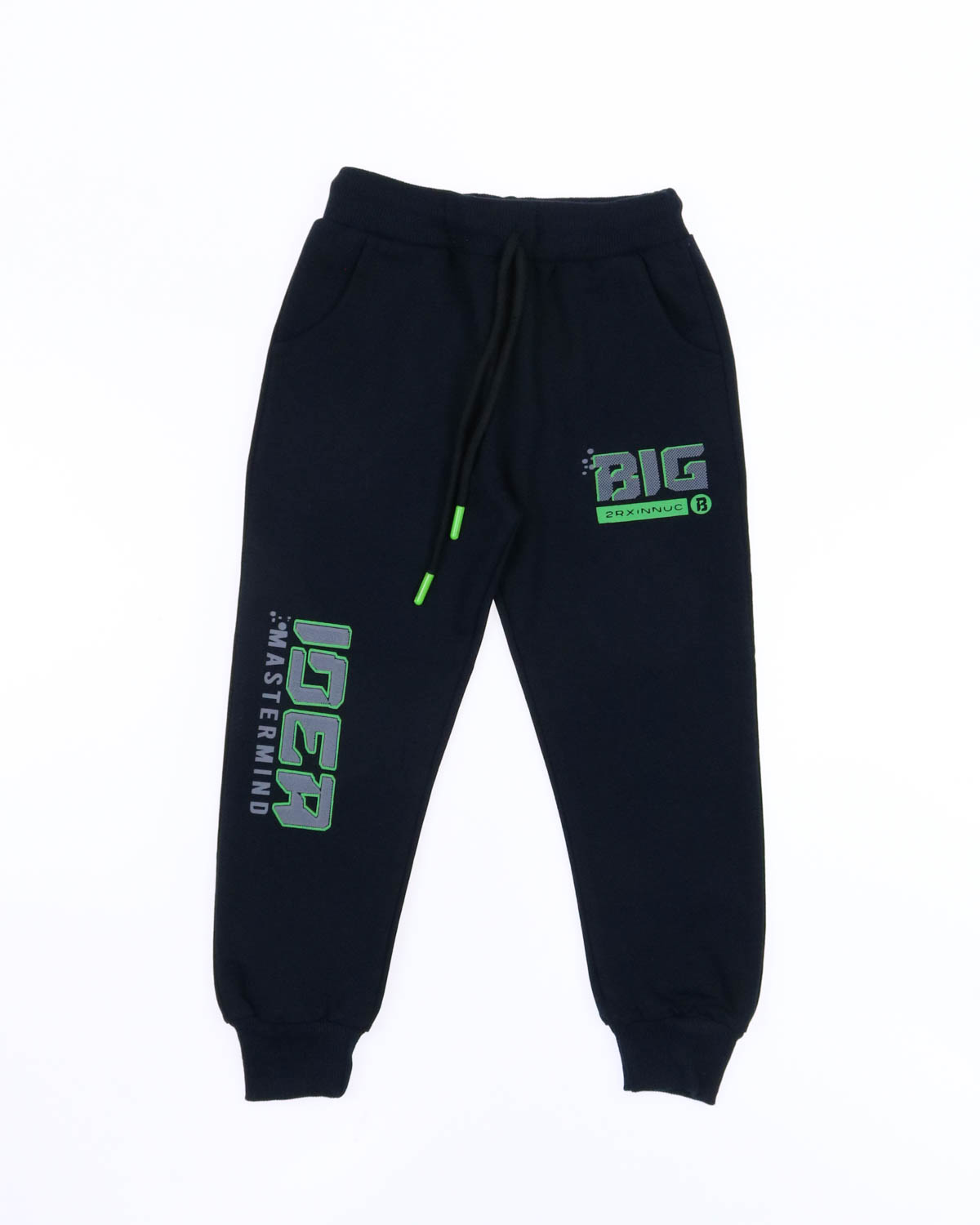 Однотонные брюки из трикотажа для мальчика, прямого силуэта, на притачном поясе с эластичной тесьмой и регулируемым шнуром спереди. Два боковых кармана, по низу брюк цельнокроеные манжеты.