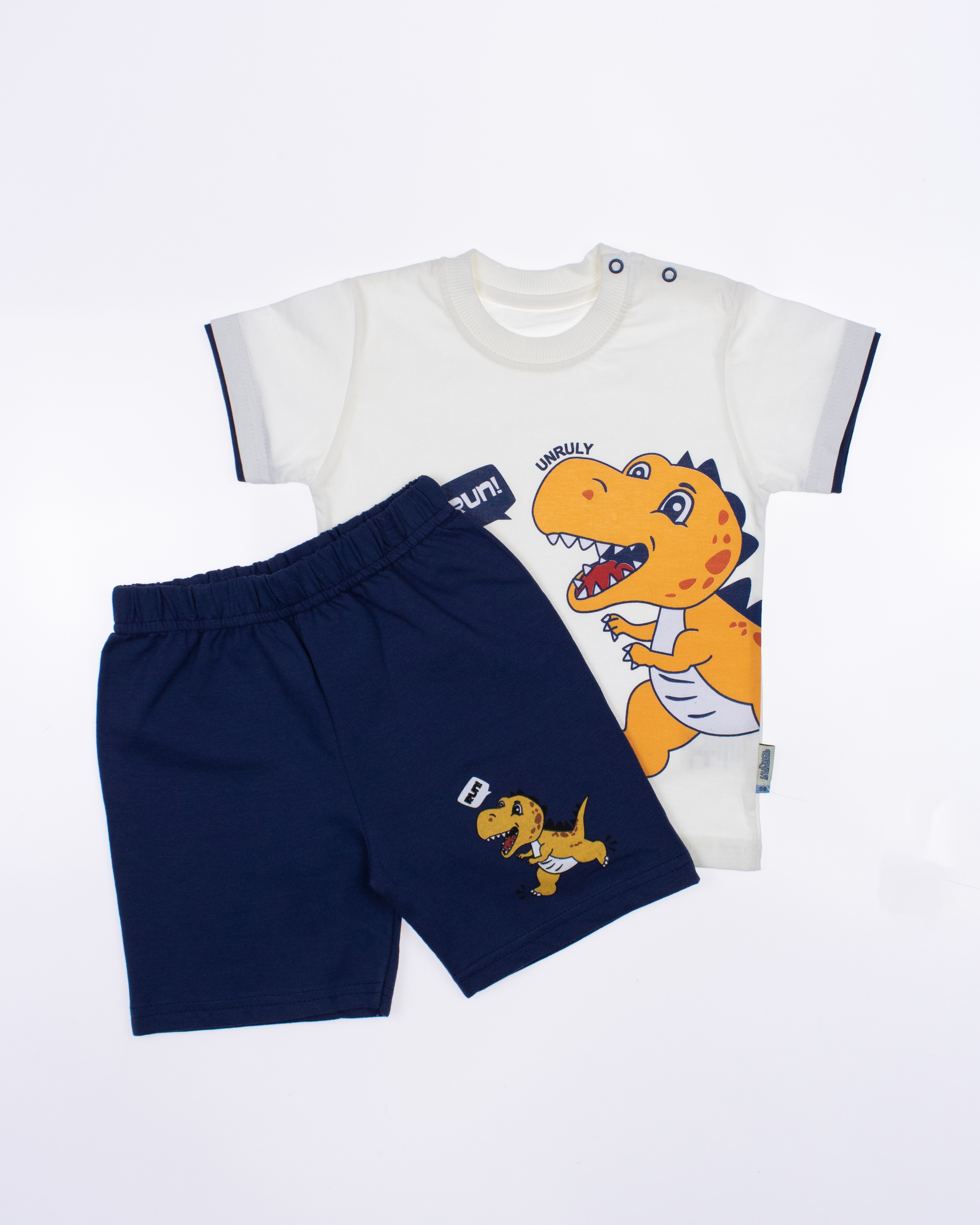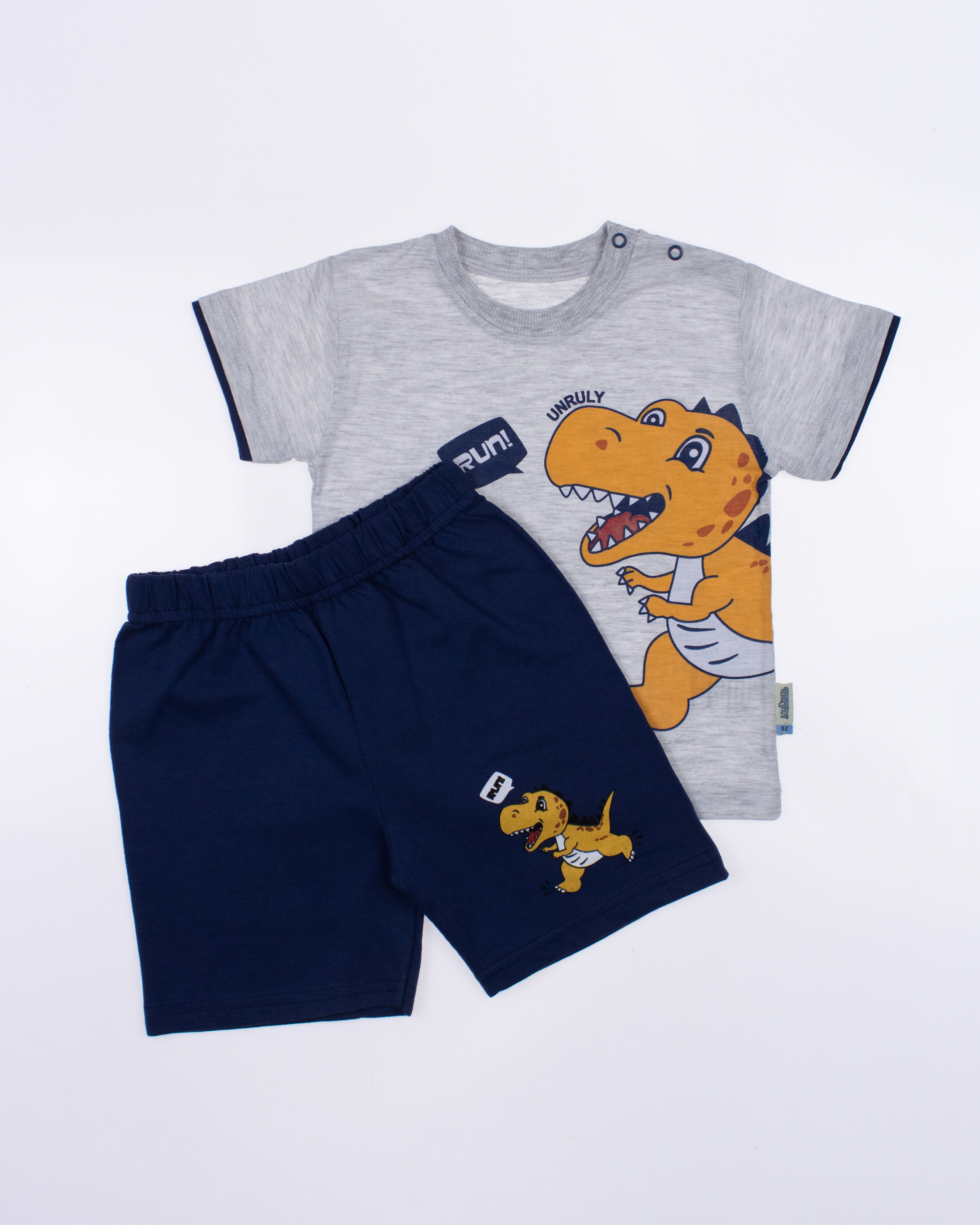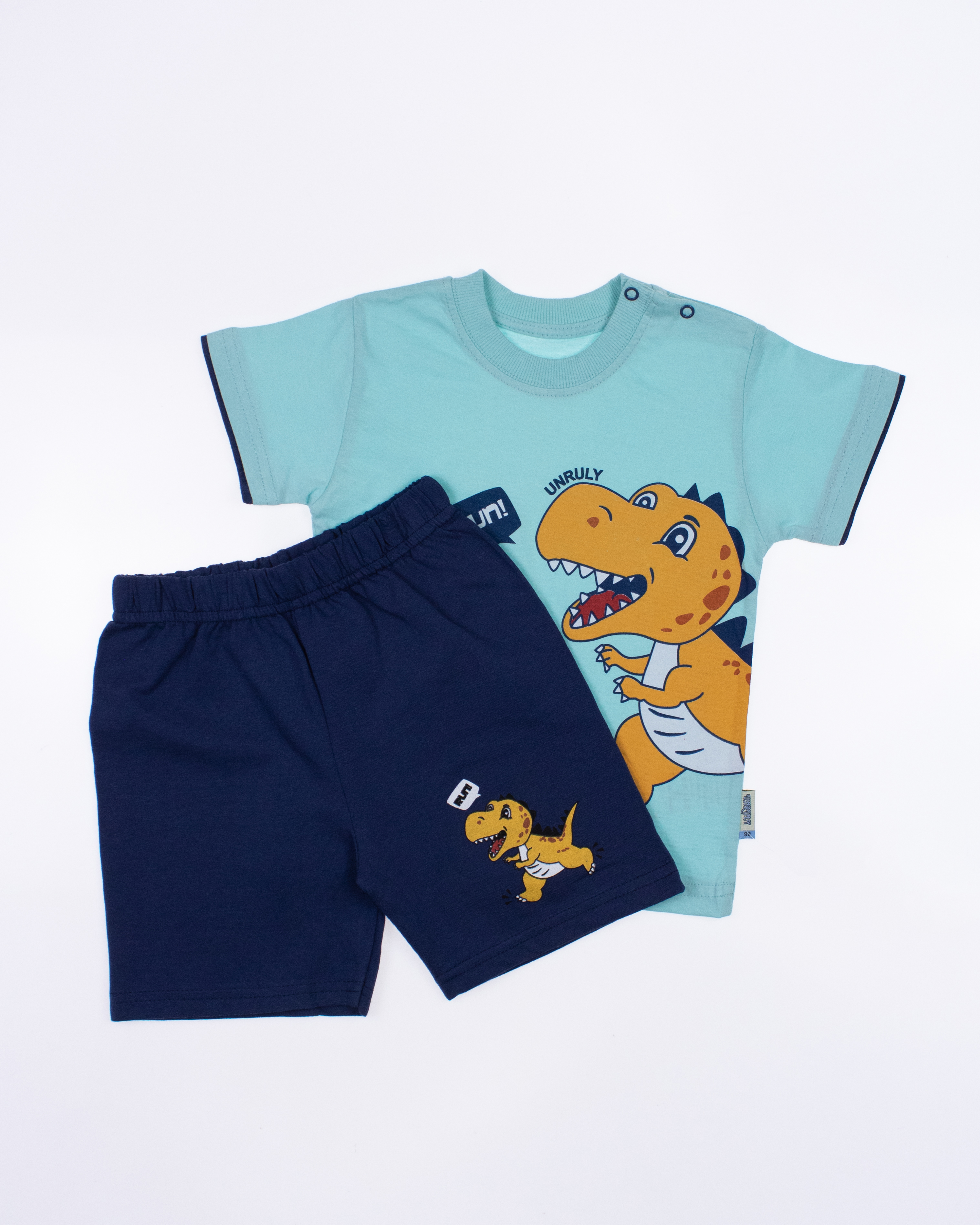 Модель выполнена из хлопкового полотна и оформлена печатным принтом. Футболка прямого кроя, с округлым вырезом горловины. Шорты умеренного объема без  карманов.