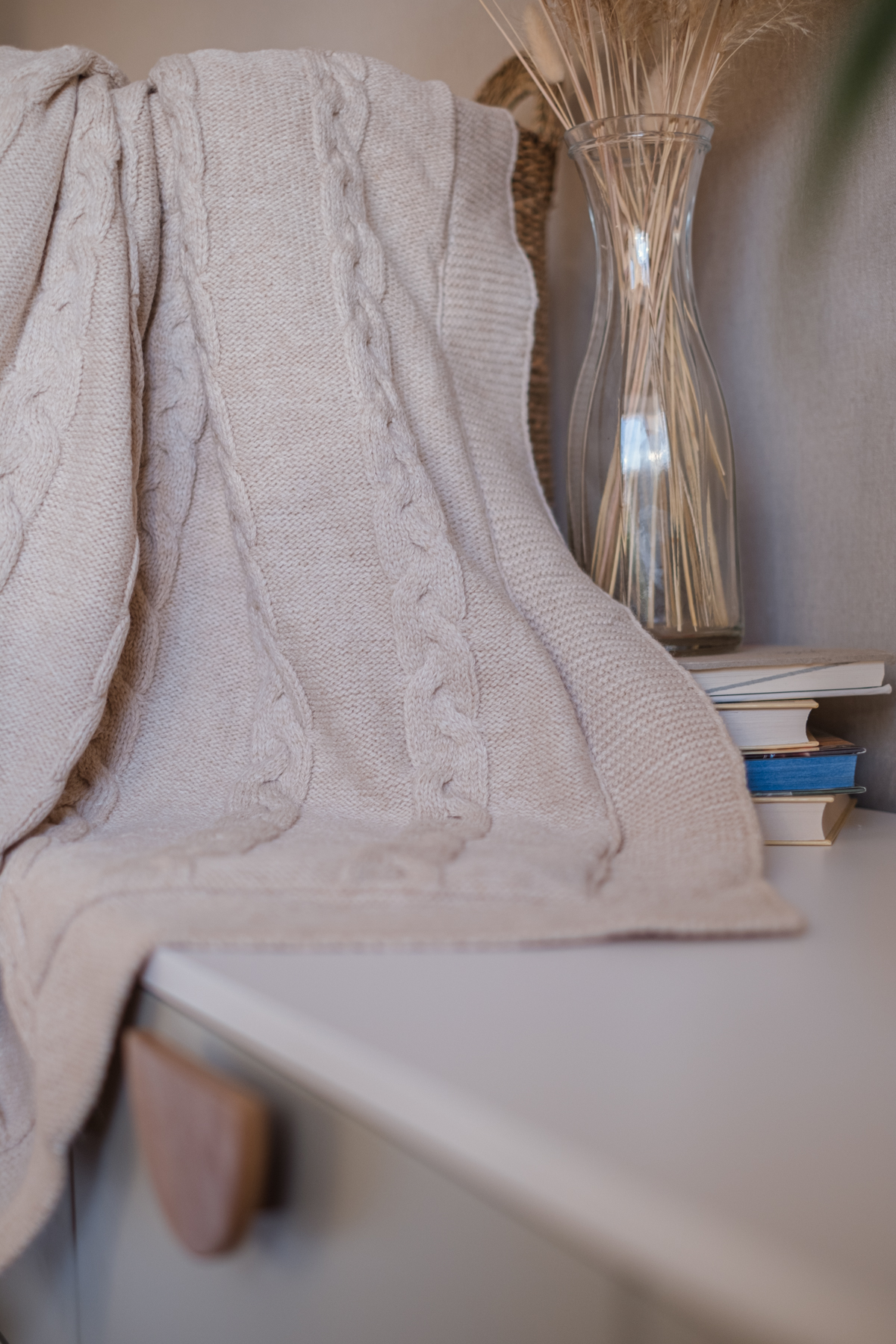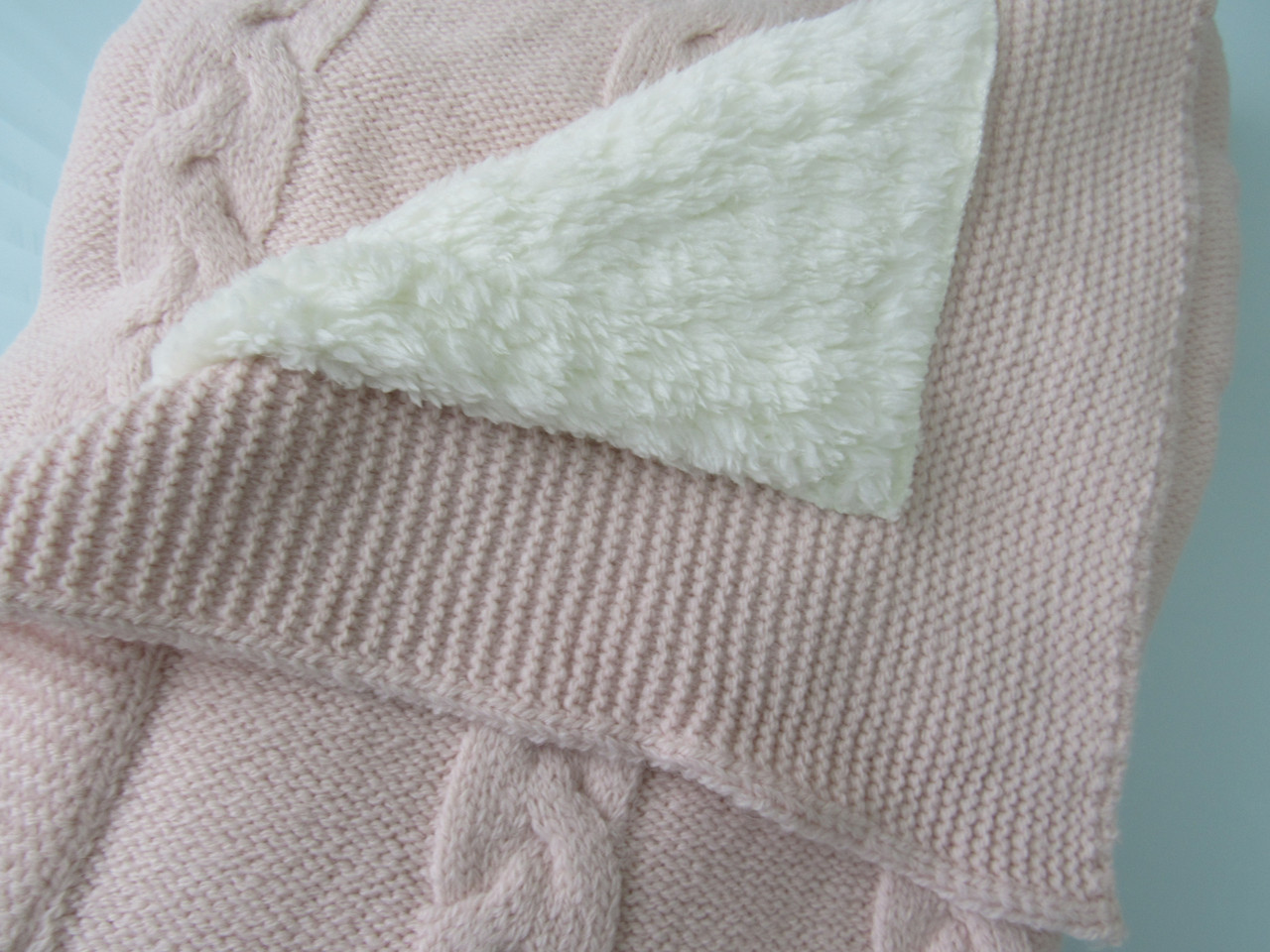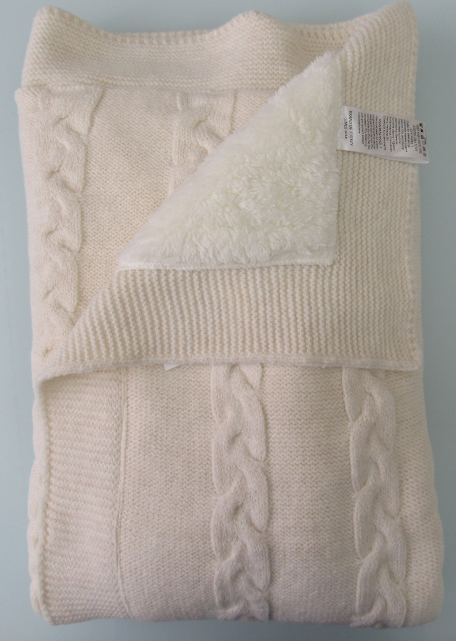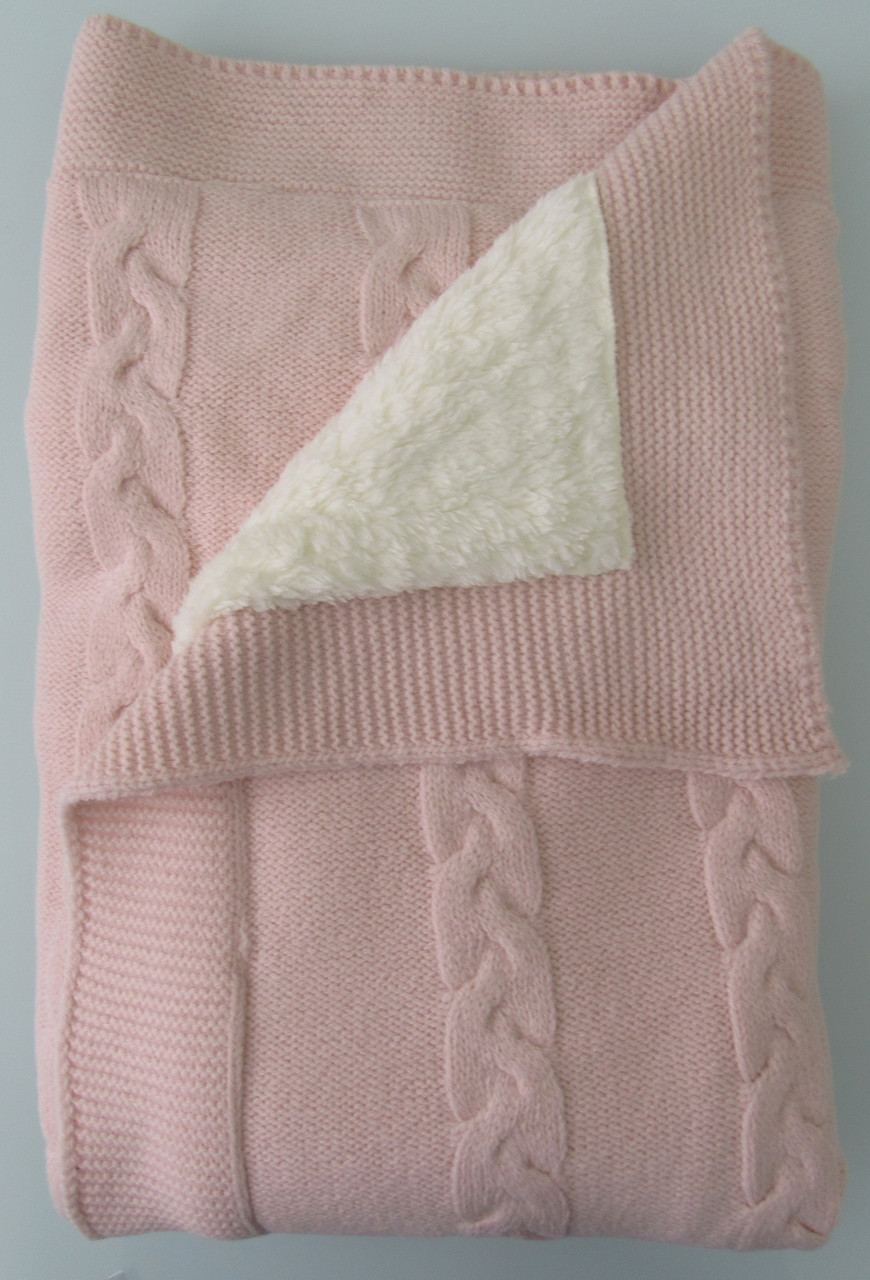 В составе этого пледа 20% шерсти. С лицевой стороны выполнен вязаный узор «косы», а с изнаночной он утеплен подкладом из ткани вельбоа, ее еще называют искусственным плюшем. Она мягкая, теплая и приятная на ощупь. Под таким пледом малыш точно не замерзнет.