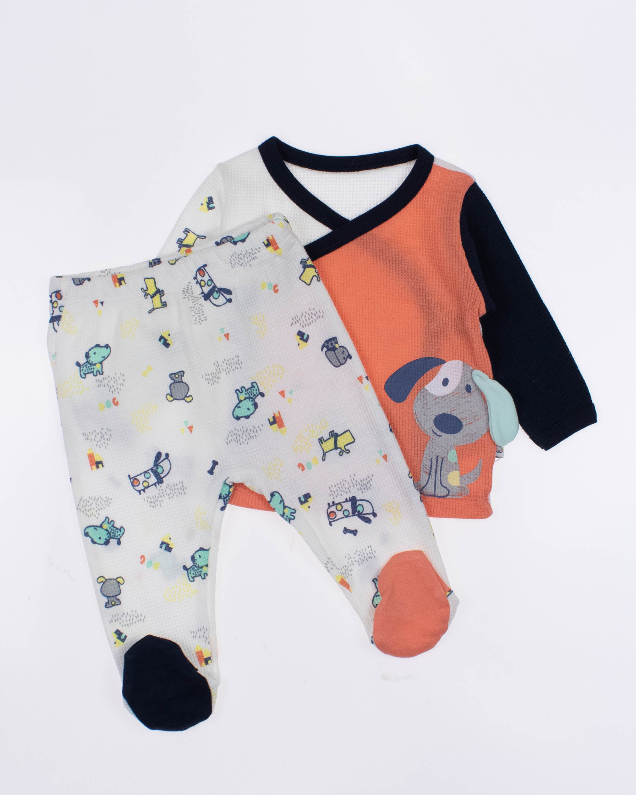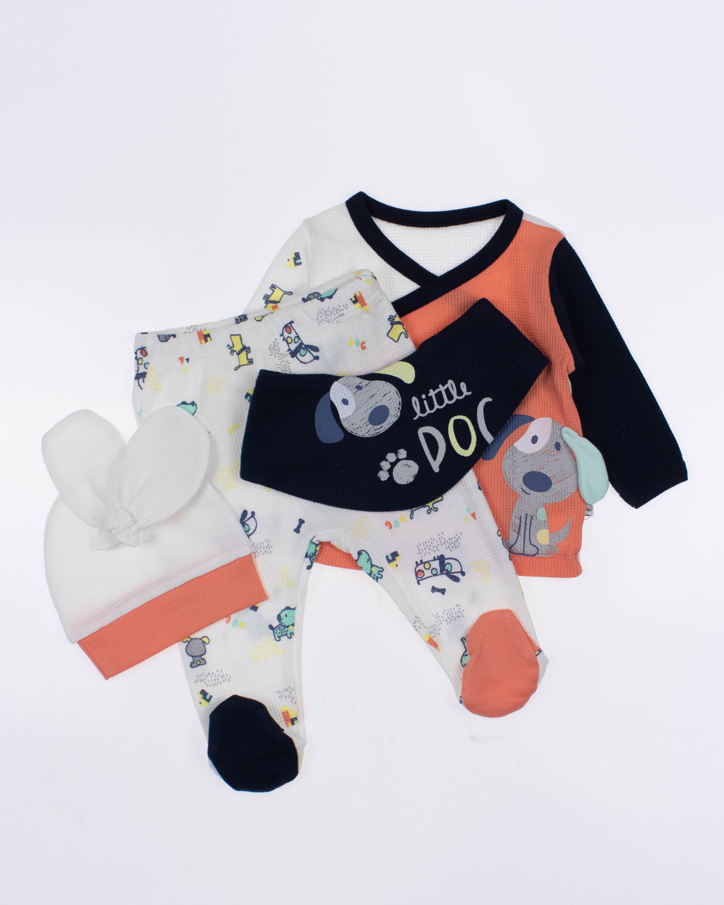 Функциональный, удобный и симпатичный комплект MYMIO BABY из  100% хлопка. Он включает в себя пять предметов: это кофточка с длинным рукавом, ползунки, шапочка, слюнявчик и рукавички. Каждую деталь можно надевать отдельно или комбинировать с другими вещами.