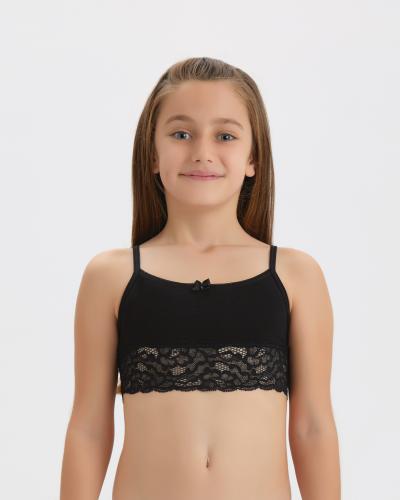 Кружевное бюстье для девочки оптом изготовлено из кулирки гладкого, приятного к телу материала. Хорошо тянется благодаря добавлению эластана. Горловина у топ-бра для девочки спереди и со стороны спинки обработана мягкой резинкой, благодаря чему не натирает и не раздражает нежную кожу ребенка. Внизу бюстье, топа пришита полоска красивого, эластичного гипюра. Топик декорировано маленьким бантиком сверху. Бюстье для девочки очень комфортно для повседневной носки. Гипоаллергенная ткань приятно прилегает к телу, впитывая излишки влаги, пропуская воздух. Современная технология пошива обеспечивает изделиям высокие качественные характеристики и идеальный комфорт. Очаровательный дизайн и милый бантик смотрятся невероятно нежно.